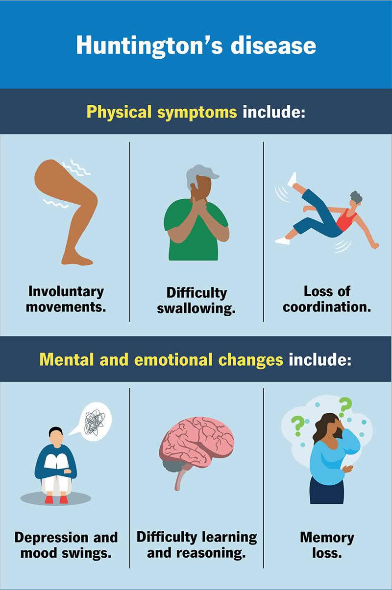 Huntington’s disease affects you both physically and mentally. Physical symptoms include: