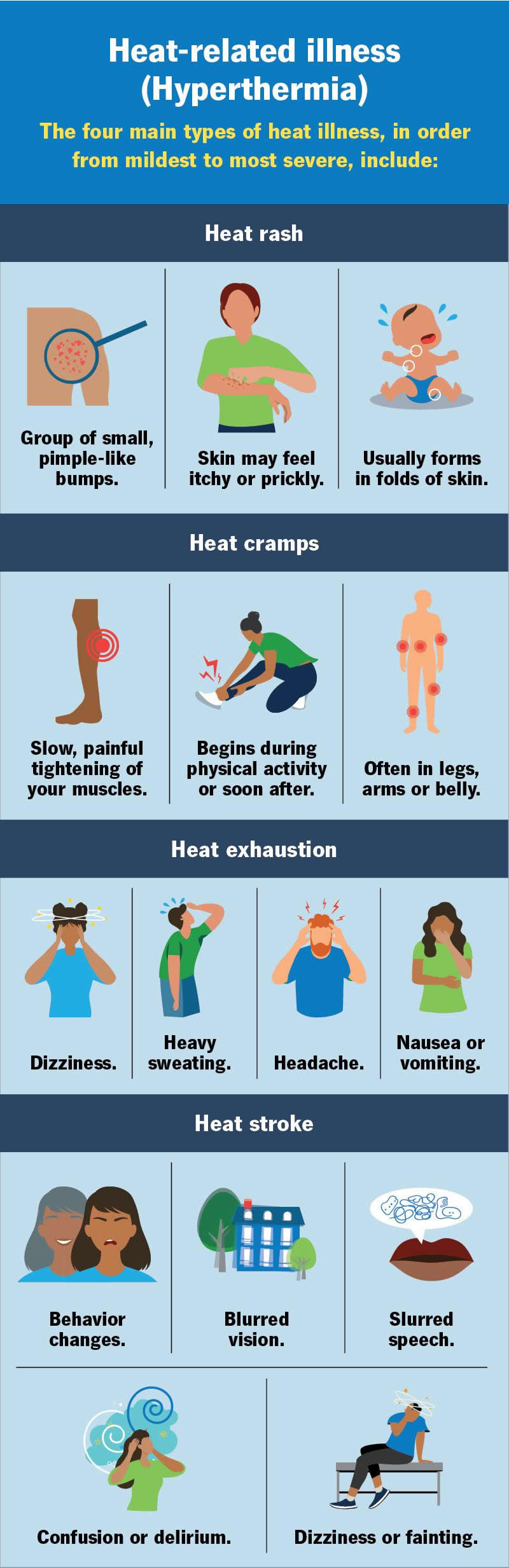 Heat-related illnesses include heat stroke, heat exhaustion, heat cramps and heat rash. Heat stroke and heat exhaustion involve an abnormally high body temperature (hyperthermia) and need immediate treatment. You can lower your risk of heat illness by staying hydrated and limiting physical activity in hot weather.