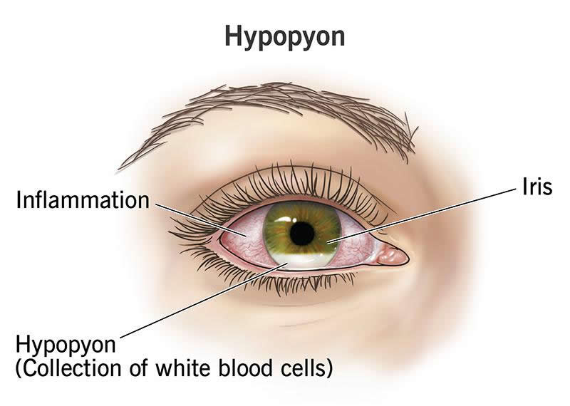 Hypopyons are pools of white blood cells that get trapped in your eye’s anterior chamber (behind your cornea and in front of your iris). They form when a condition or infection causes inflammation in your eye. Treating the issue that caused a hypopyon will make it go away. Visit an eye care specialist right away to get the cause diagnosed as soon as possible.
