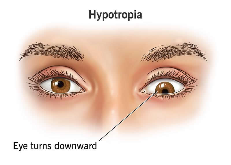 Hypotropia is a form of eye misalignment (strabismus) in which your eye turns downward involuntarily. It’s the opposite of hypertropia (an upward eye turn). You may have hypotropia by itself, or your eye may drift downward and to one side. Hypotropia with esotropia (an inward turn) often occurs with a condition called heavy eye syndrome. Hypotropia can also occur with exotropia (an outward turn).