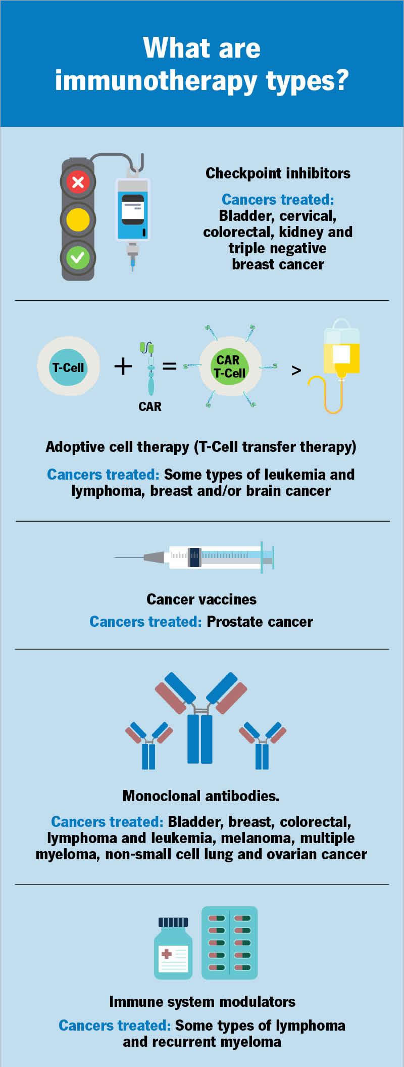 Immunotherapy for cancer uses your body’s immune system to find and destroy cancerous cells. There are several different immunotherapy types, but all immunotherapy works by training your immune system to do more to fight cancer. Current immunotherapies can’t cure cancer, but they may help some people with cancer live longer.
