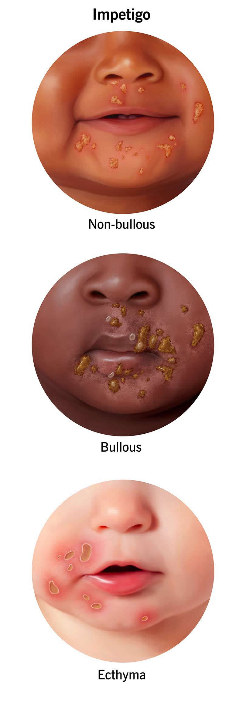 There are a few different types of impetigo, including non-bullous, bullous and ecthyma.