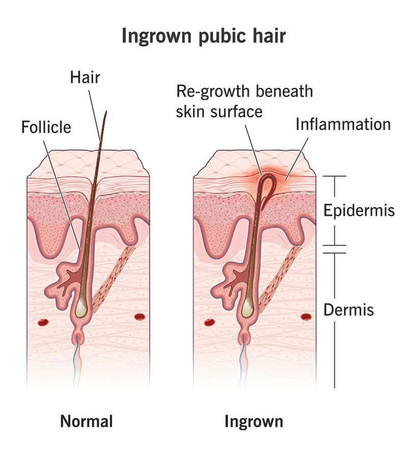 Removing hair from your pubic area by shaving, waxing or plucking may cause ingrown hairs. As your hair grows back, it may not grow straight out of the surface of your skin. Instead, it can curve and get trapped under your skin.