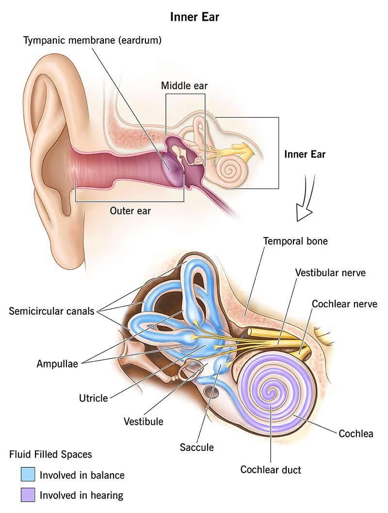 Your inner ear includes two parts: the cochlea (which supports your hearing) and the vestibular system organs (which support your balance).