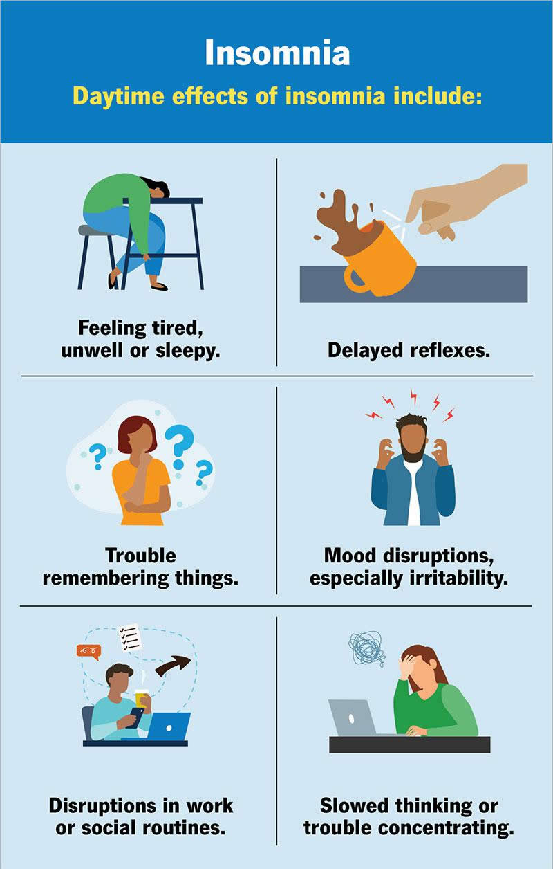 Because you need sleep to be your best, disruptions like insomnia commonly cause symptoms that affect you while you’re awake. These include: