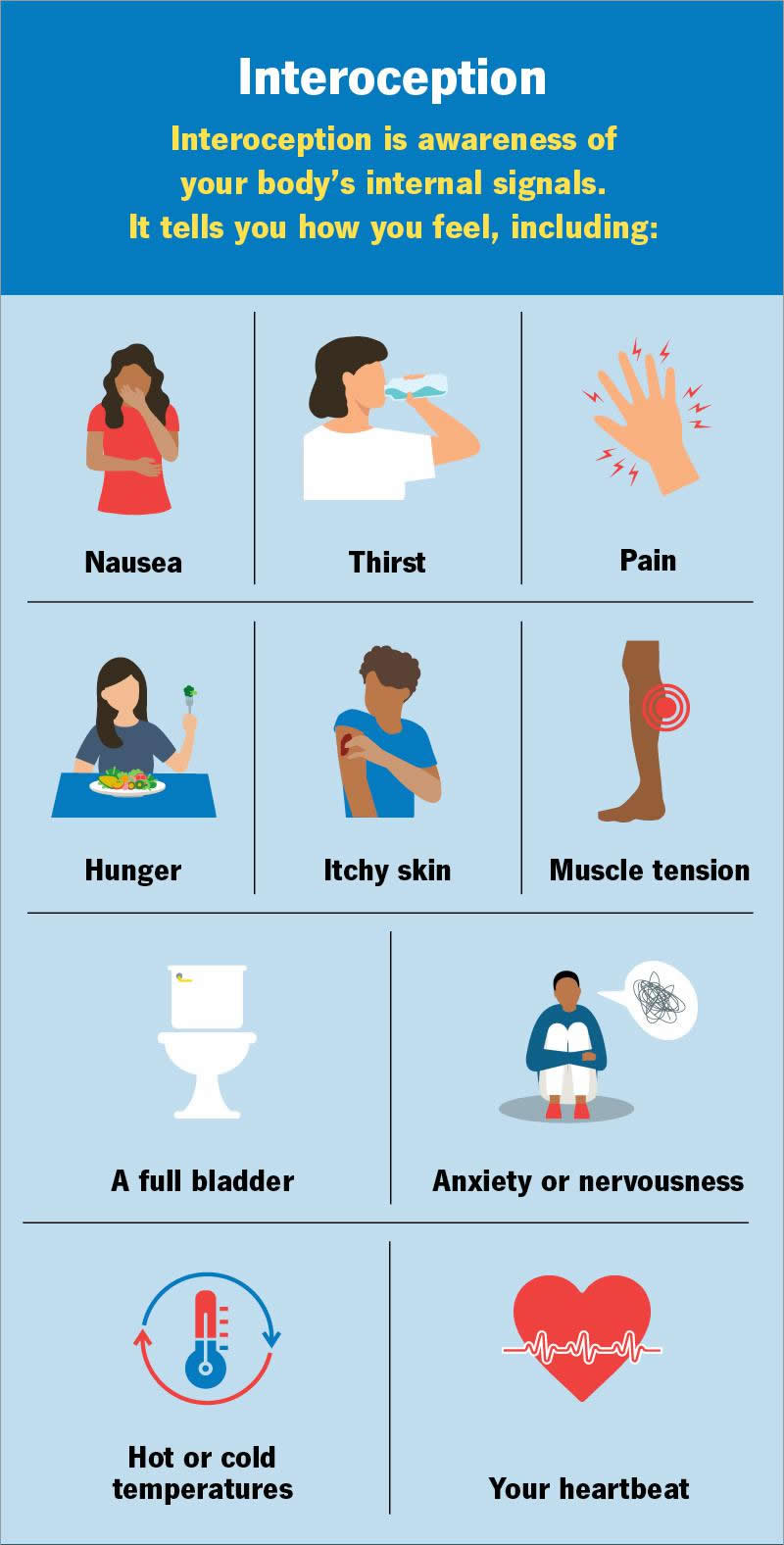 Interoception is the understanding of your body’s internal senses. You can feel that you’re hungry, that your heart is beating or that you need to pee. It’s a learned skill that you develop as you grow. Certain conditions may make it more difficult for you to feel internal senses than others. Mindfulness exercises and therapy may help.