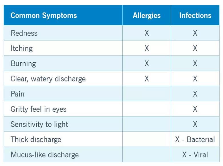 Eye infections can come from many causes — virus, bacteria, parasite or fungus — and the symptoms vary with the cause, but in general, infections have a longer list of symptoms when compared to allergies.
