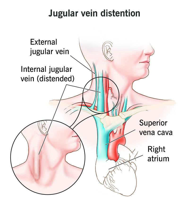 Jugular vein distention happens when there’s any kind of backup of blood in the superior vena cava or in your heart itself. Much like heavy traffic on a freeway can lead to backups and traffic jams, slowed blood flow in the heart or superior vena cava can cause blood to back up into the jugular veins. That makes the pressure in the jugular vein higher than it should be, which causes the vein to bulge outward.