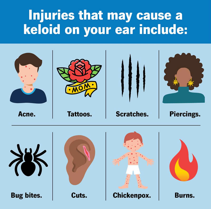 Ear keloids usually form after you injure the skin on your ear. Injuries that may cause a keloid on your ear include: