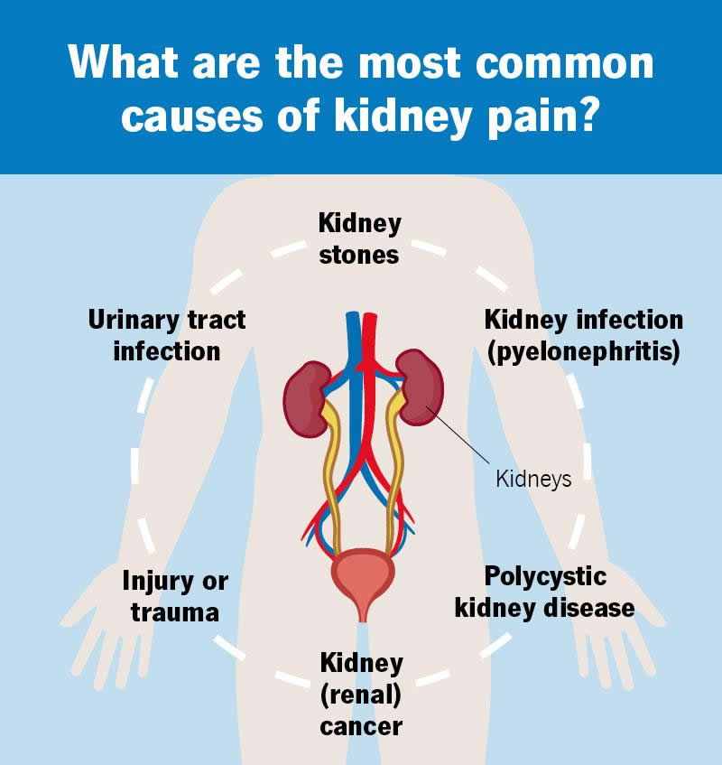 Kidney pain is felt in your sides, back, belly or groin. It’s often mistaken for back pain. Kidney pain can be caused by kidney stones, kidney infection, an injury or kidney cancer. Kidney pain treatment depends on the underlying cause.
