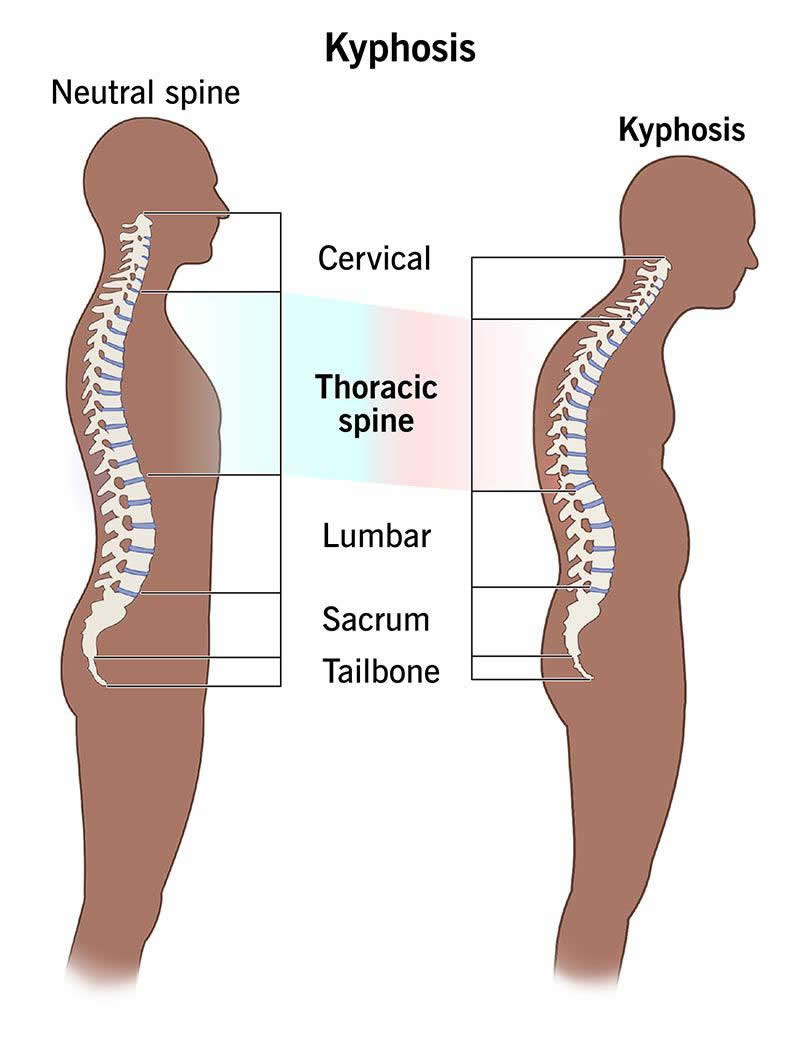 Kyphosis is a condition where your spine curves outward more than it should. This causes your upper back around the thoracic region (the part of your spine between your neck and ribs) to bend forward. The curvature can make it look like you’re hunched over or slouching. People sometimes call it “hunchback” or “roundback.”