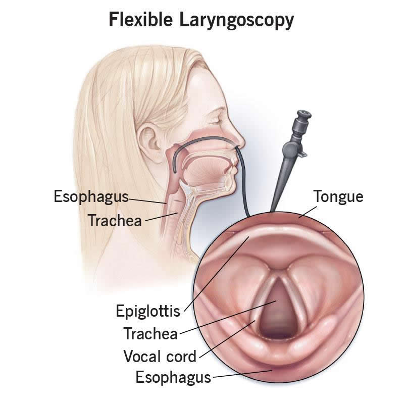 - They also may use a flexible laryngoscope. This is a flexible fiberoptic scope inserted through your nose to look down your throat.