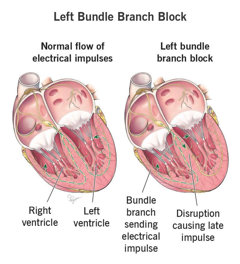 If you have LBBB, the bundle branch that carries the electrical impulse to your left ventricle is either partially or completely blocked. This problem causes your right ventricle to contract before your left ventricle, making it harder for your heart to pump blood efficiently.
