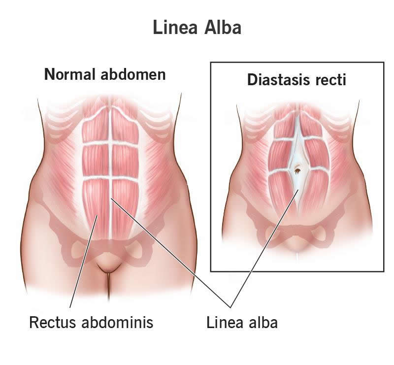 The linea alba can stretch like a rubber band. When a person is pregnant or has obesity, their linea alba stretches to accommodate their growing belly. Sometimes the linea alba is stretched so far that it doesn’t come back together. As a result, the left and right sides of the abdominals remain separated. This is called an ab gap or abdominal separation. Exercises or physical therapy can typically help heal an ab gap.
