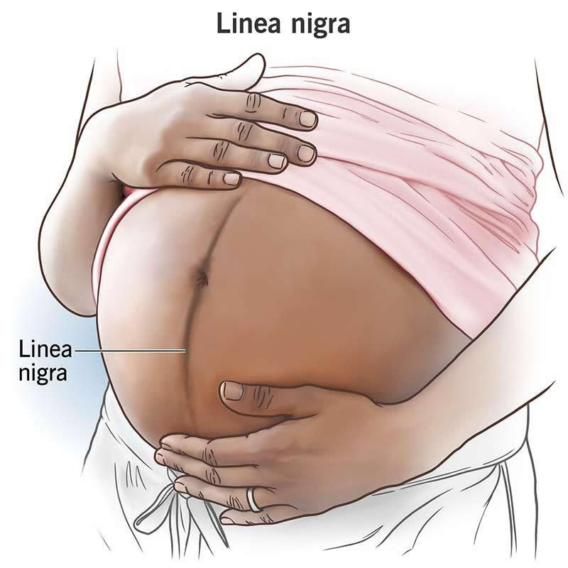 The linea nigra is a dark vertical line that appears on the skin of your stomach during pregnancy. It's also called the pregnancy line. It runs from your belly button to your public area but can extend towards your abdomen. The linea nigra may appear darker as your pregnancy develops and is more visible in people with darker complexions. Linea nigra is Latin for "black line."