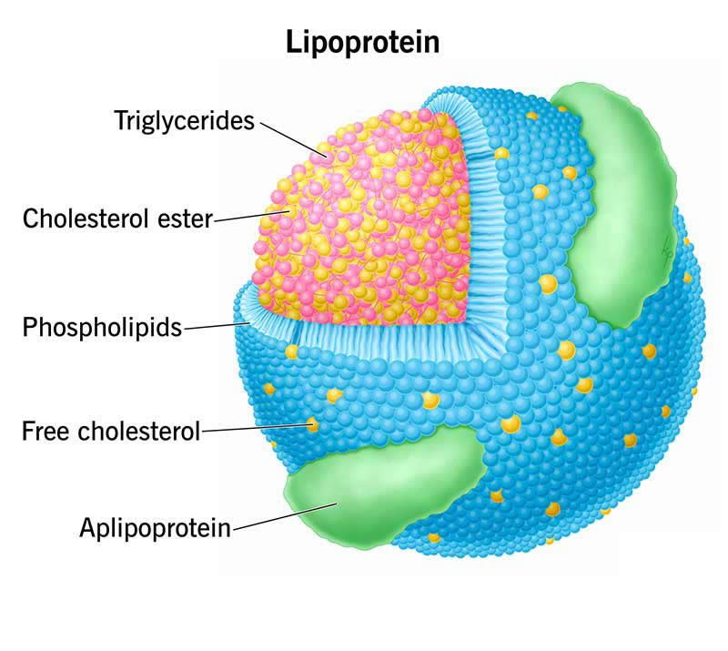 Lipoproteins are round particles made of fat (lipids) and proteins that travel in your bloodstream to cells throughout your body. Cholesterol and triglycerides are two types of lipids found in lipoproteins.