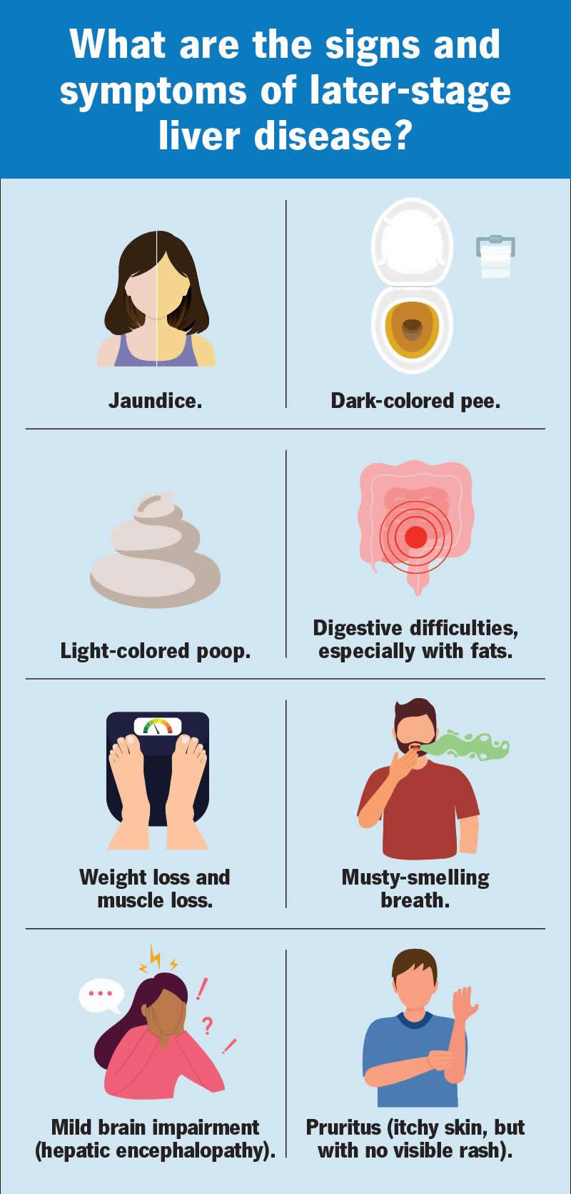 You might begin to notice more symptoms when your liver function begins to decline. This happens in the later stages of liver disease. One of the first side effects of declining liver function is that bile flow stalls in your biliary tract. Your liver no longer produces or delivers bile effectively to your small intestine. Instead, bile begins to leak into your bloodstream. This causes specific symptoms, including: