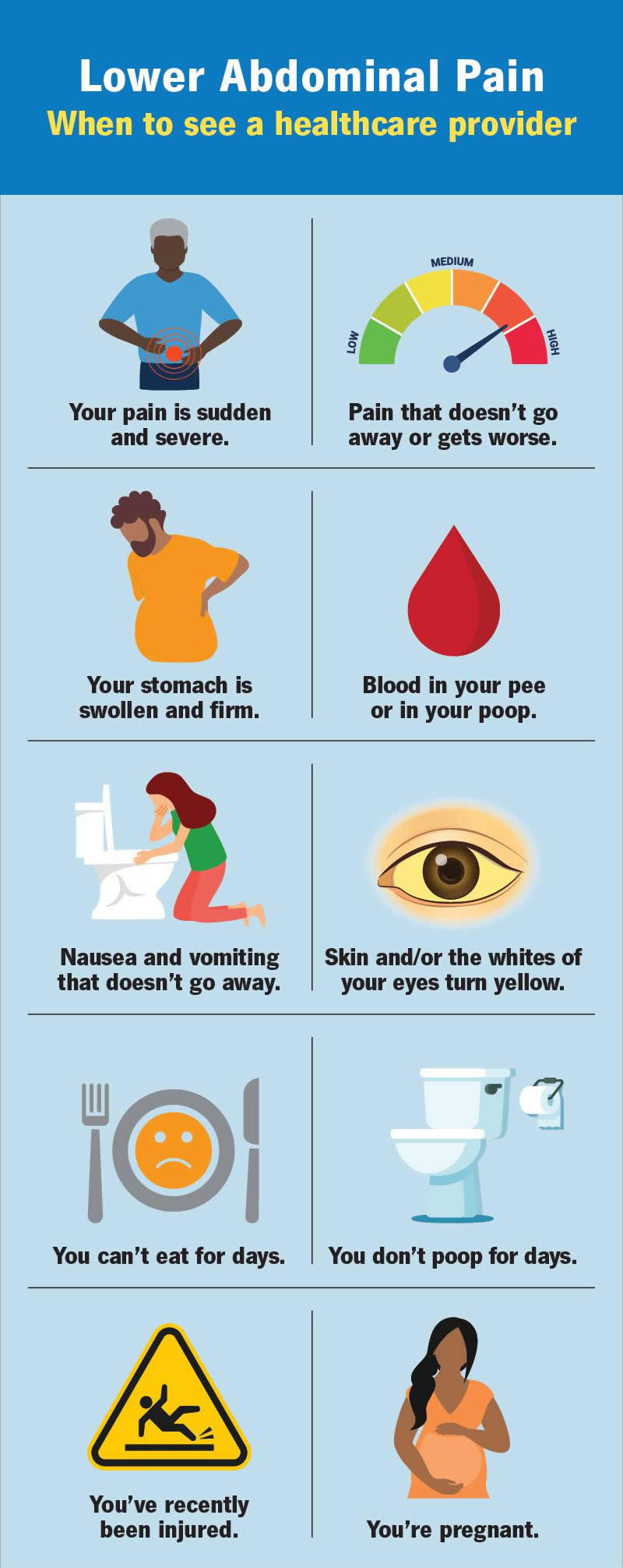 If you have abdominal pain below your belly button, your healthcare provider might call it lower abdominal pain. Dividing the abdomen into regions helps narrow down the many causes of abdominal pain.