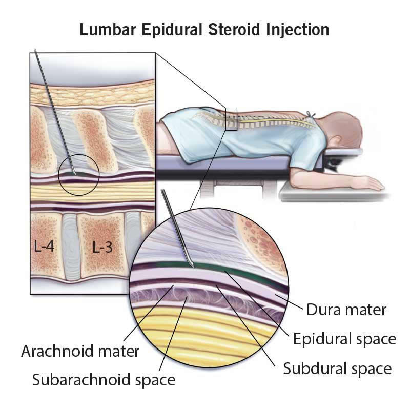 During a lumbar epidural steroid injection procedure, your provider injects a steroid into the epidural space around your spinal cord. The epidural space surrounds your spinal cord like a sleeve and contains fat, spinal nerves, blood vessels and connective tissue. The steroid acts on the irritated nerve(s) that are causing your pain and reduces swelling and pressure on the nerves.