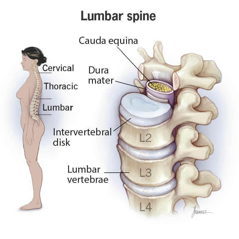 Your lumbar spine is the lower back region of your spinal column or backbone. It consists of five bones (L1-L5). Other structures in or around your lumbar spine are your intervertebral disks, spinal cord and nerves, muscles, tendons and ligaments. Your lumbar spine supports the weight of your body and allows a wide range of body movements. Many diseases and disorders can affect your lumbar spine. Fortunately, many nonsurgical and surgical options can treat these conditions.