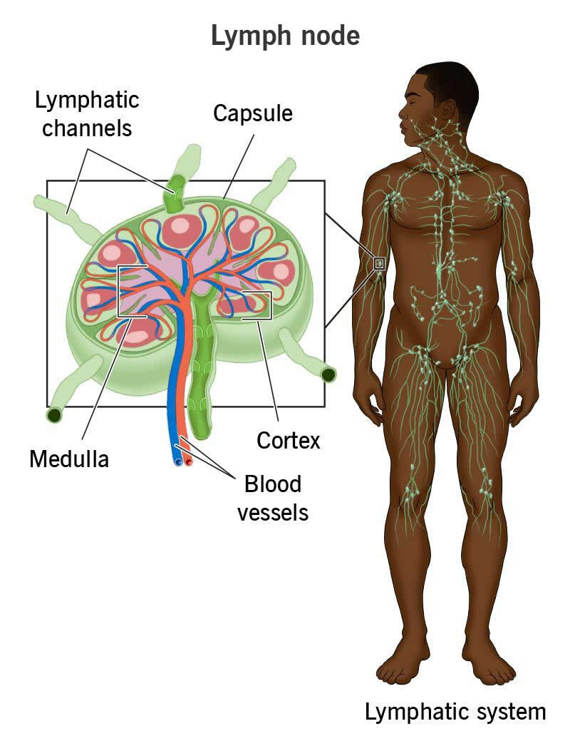 Lymph nodes are bean-shaped areas of tissue that filter fluid in your body (lymph) for harmful substances or cells. Immune cells in lymph nodes remove germs, damaged cells and cancer cells. Lymph moves from lymph vessels to lymph nodes for filtering before the fluid goes back into your blood.
