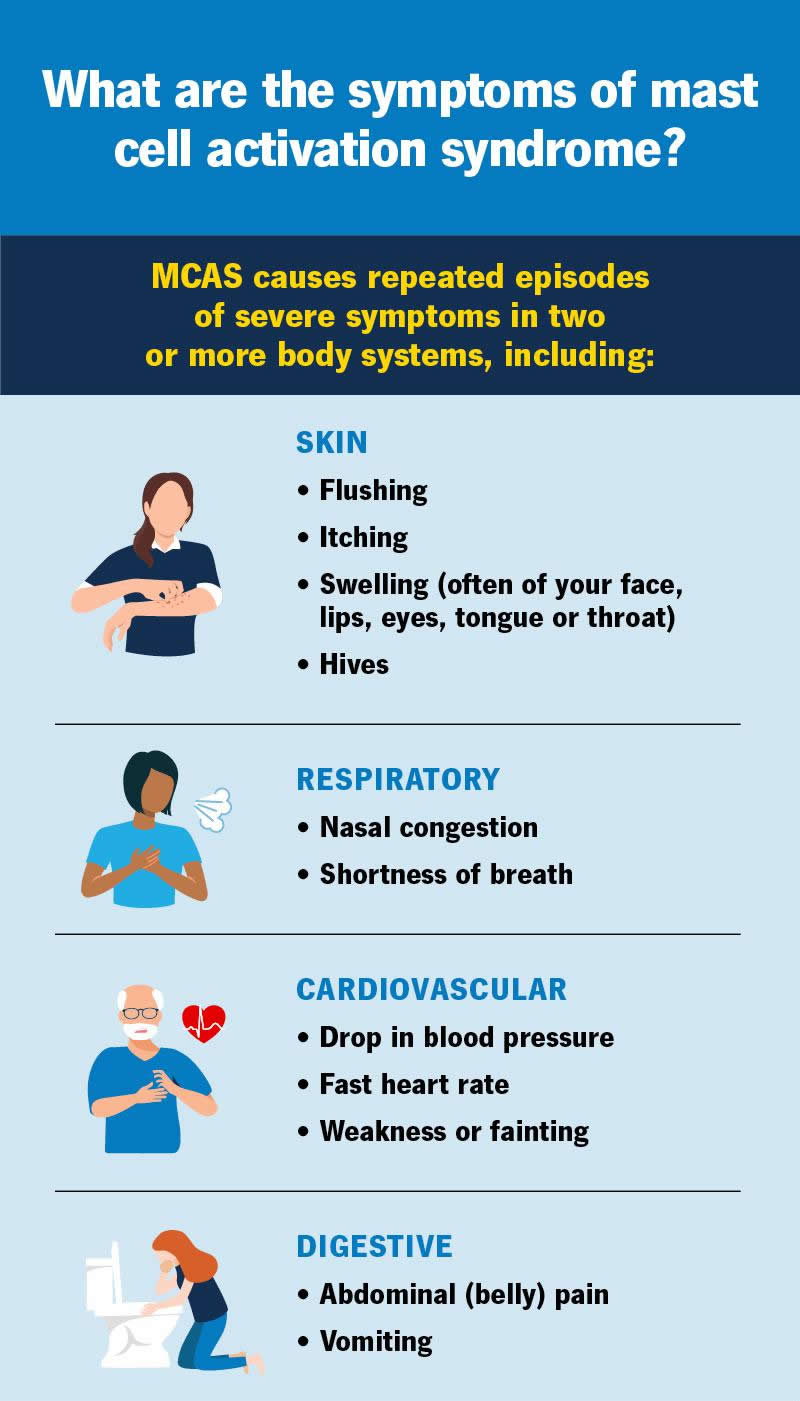 Mast cell activation syndrome (MCAS) is when you have unexplained episodes of severe symptoms like swelling, diarrhea, vomiting, flushing and itching. Unlike allergies that happen with a specific exposure, MCAS episodes happen without a clear trigger.