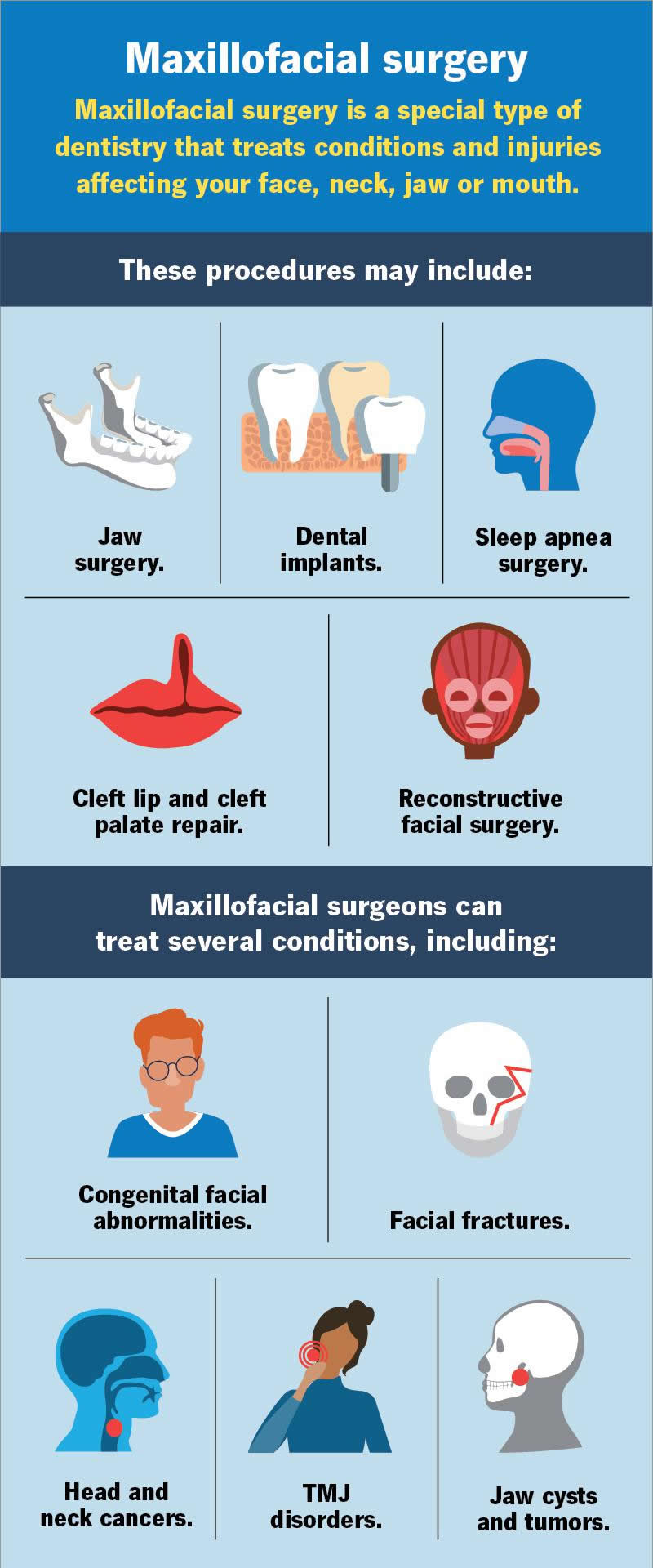 Maxillofacial surgeons can treat several conditions, including: