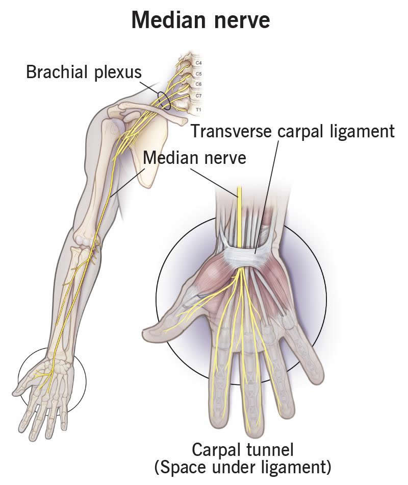 Your median nerve provides motor (movement) functions to your forearm, wrist and hand. It also sends touch, pain and temperature sensations from your lower arm and hand to your brain. A pinched median nerve can cause carpal tunnel syndrome. If that happens, you may develop wrist pain and problems grasping and holding items.