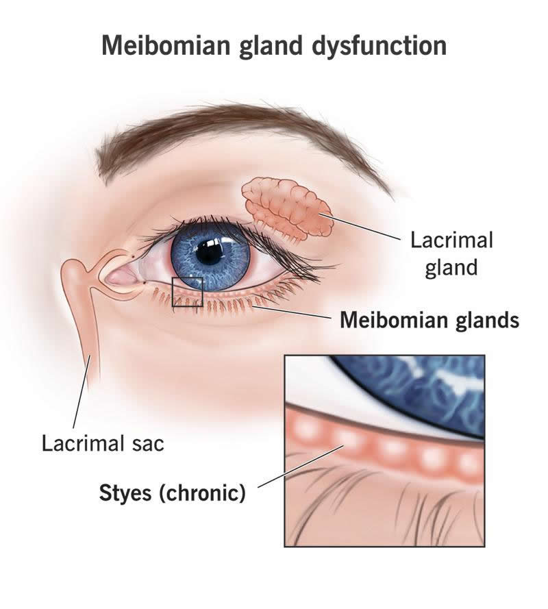 If you have meibomian gland dysfunction, the glands near your lids aren’t producing enough oil or good quality oil. The oil is one of the ways that your eyes protect themselves. Having dry eyes can cause other problems. Treatments can include eye drops or probes into the glands.