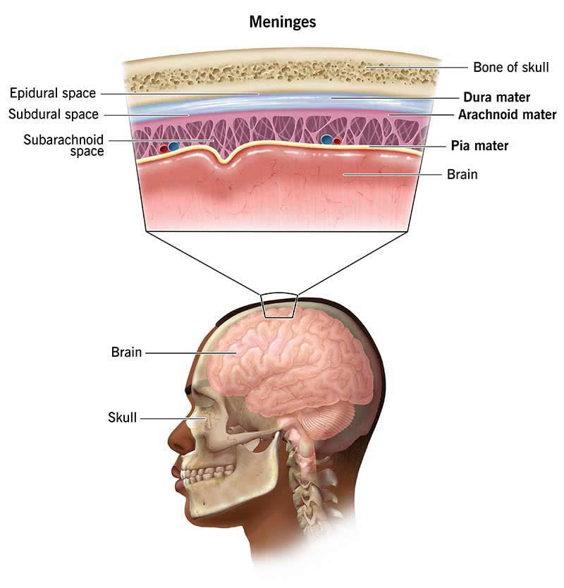 Your brain and spinal cord are protected and supported by three meningeal layers. These membrane layers are the dura mater, arachnoid mater and pia mater. The layers plus cerebrospinal fluid keep your brain tissue from jostling against your skull, as well as other functions. Trauma to your head, however, can cause bleeding within any of your meninges and/or your brain tissue itself (intracranial hemorrhage). Be sure to see your healthcare professional if you experience a blow to your head from a trauma (like a car accident), sports injury or fall.