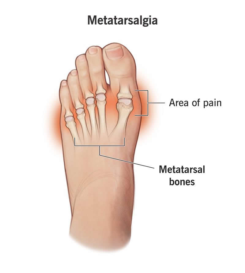Metatarsalgia (pronounced “MET-ah-tar-SAL-gee-ah”) refers to pain and inflammation in the ball of your foot, or forefoot. This is the area between the arches and toes on the bottom of your foot. The pain of metatarsalgia typically centers under one or more of the five bones at the bases of your toes, the metatarsal heads.