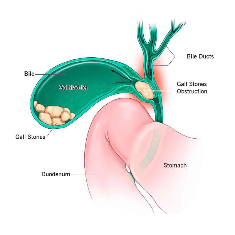 | One or more gallstones stuck in your gallbladder or in your cystic duct (the tube that carries bile from your gallbladder) press on a nearby duct, blocking the flow of bile. | |