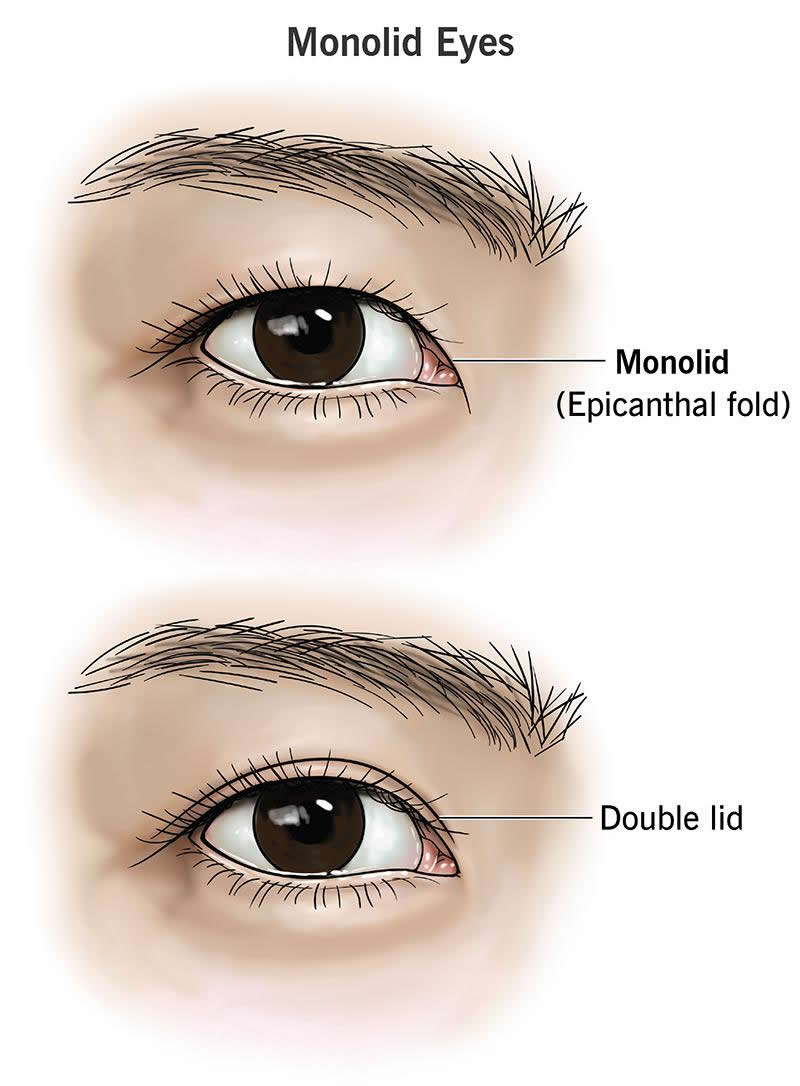 Monolid eyes, or epicanthal folds, are an eyelid shape commonly seen in people of Asian descent. It’s also seen in people with genetic conditions. With monolid eyes, the skin of your upper eyelids covers the inner parts of your eyes. You don’t have folds dividing your eyelids into two parts. Monolid eyes are typically a harmless trait.
