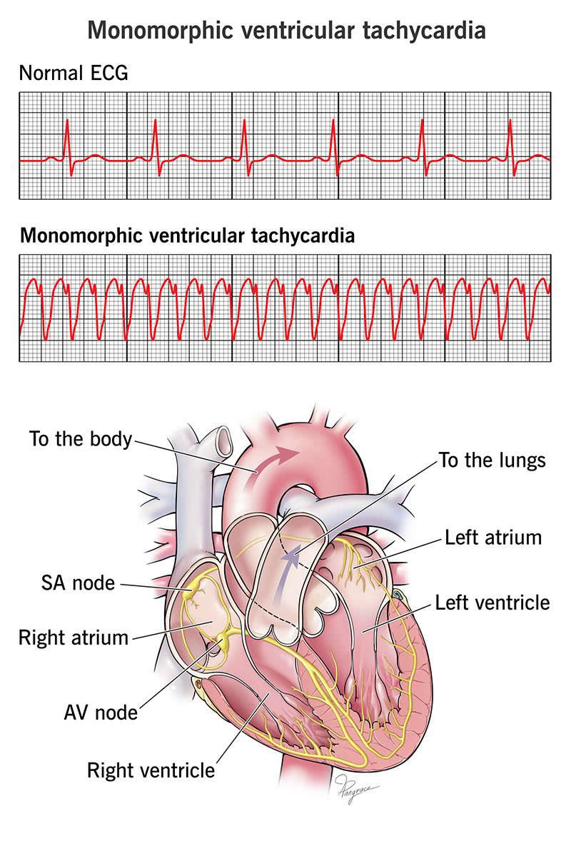 Monomorphic ventricular tachycardia is a type of irregular heart rhythm (arrhythmia) that happens when the lower chambers of your heart beat at a dangerously fast pace. It can turn into a dangerous — or even deadly — problem depending on how and when it happens.