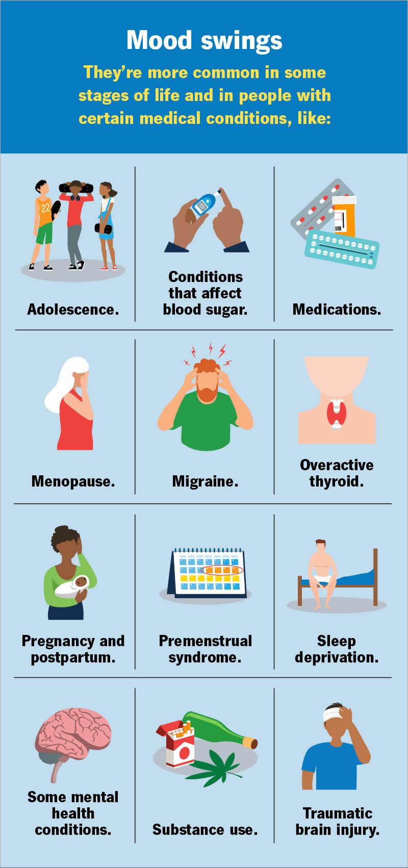 With so many factors that can contribute to mood swings, they can start to feel like a part of everyday life. And there's some truth to that. But that doesn’t mean they have to disrupt your life or make you feel like you’re no longer in the driver’s seat. There’s a lot you can do to manage mood swings — from changes to your daily routine to medical treatment. And you don’t have to do it alone. If you’re having more — or more intense — mood swings or they become a source of tension in your relationships, a healthcare provider can help.
