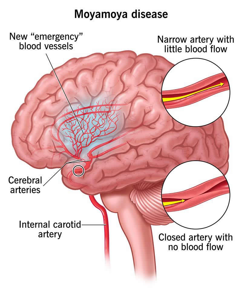 Moyamoya disease is a rare condition that affects the blood vessels in your brain. It can lead to brain bleeds and stroke in affected areas of your brain. There’s no cure for moyamoya disease. Treatment typically involves managing symptoms and preventing blood clots with medications. You may also need surgical bypass to supply more arteries to your brain for adequate blood flow.