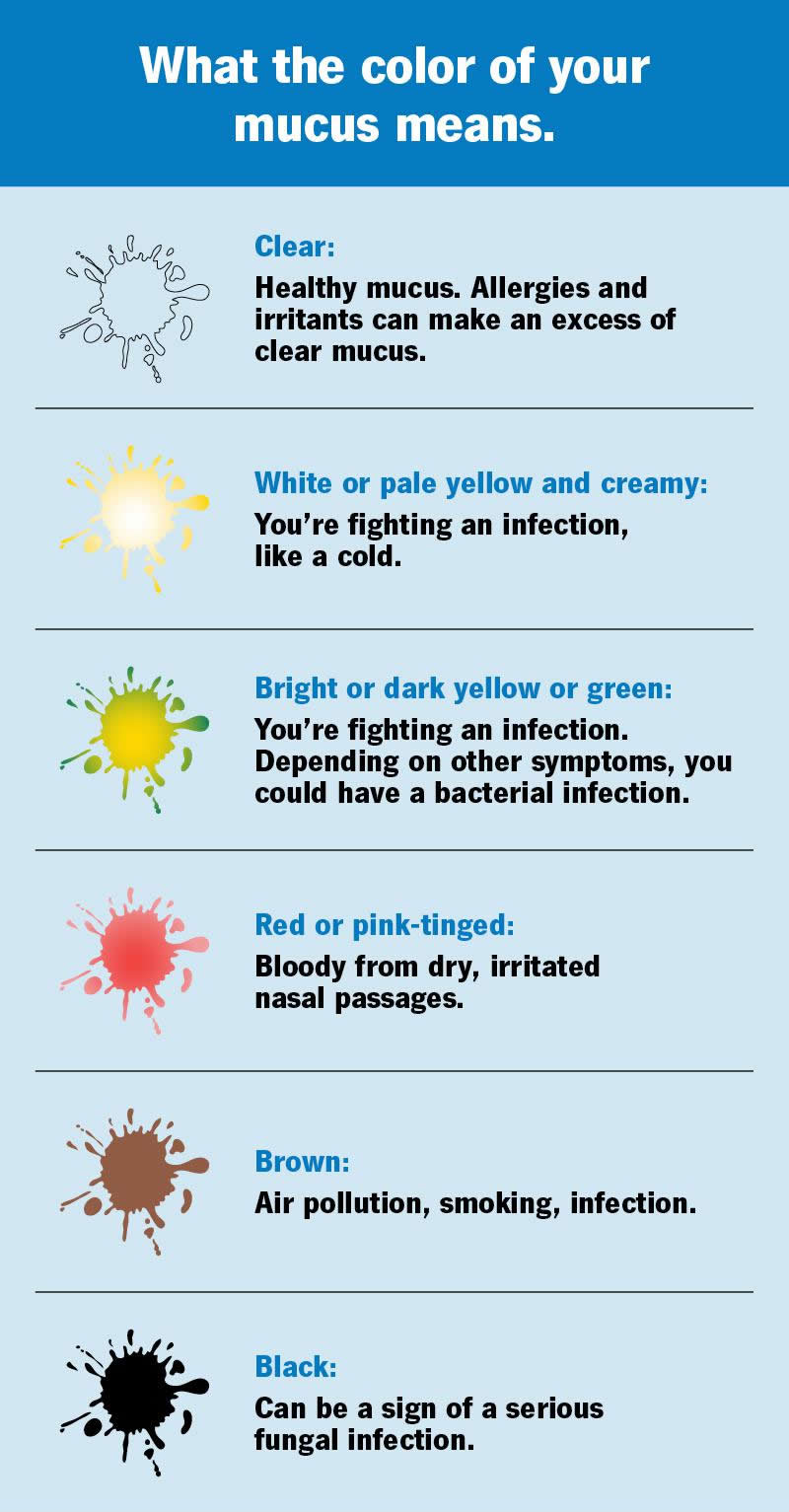 Mucus color alone won’t tell you if you have a specific kind of infection. See a healthcare provider if you have dark-colored mucus — or any other color that concerns you — especially if you have other symptoms, like facial pain or headaches.