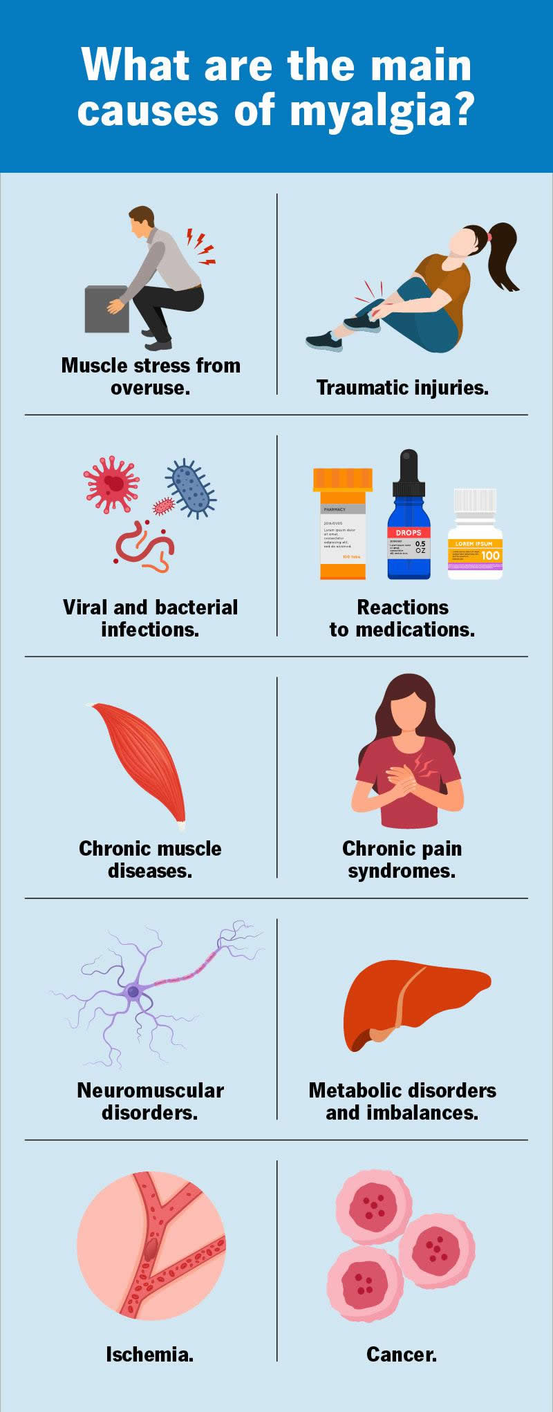 All sorts of things can cause myalgia. Some of the main types of causes include: