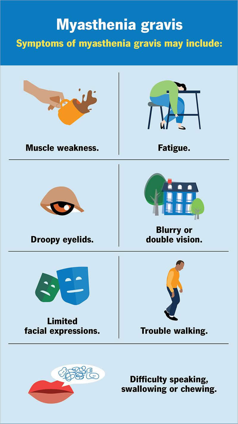 Myasthenia gravis is an autoimmune condition that causes skeletal muscle weakness. These are the muscles that connect to your bones and help you move. Myasthenia gravis usually targets the muscles in your eyes, face, neck, arms and legs. It can affect your ability to: