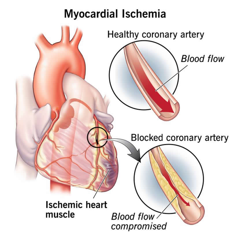 Myocardial ischemia is a lack of blood flow getting to your heart muscle. That means your heart muscle isn’t getting enough blood to do what it needs to do. Often, the cause is a collection of fat and cholesterol (plaque) that doesn’t let enough blood go through your coronary arteries. Medicines and surgeries can treat myocardial ischemia.