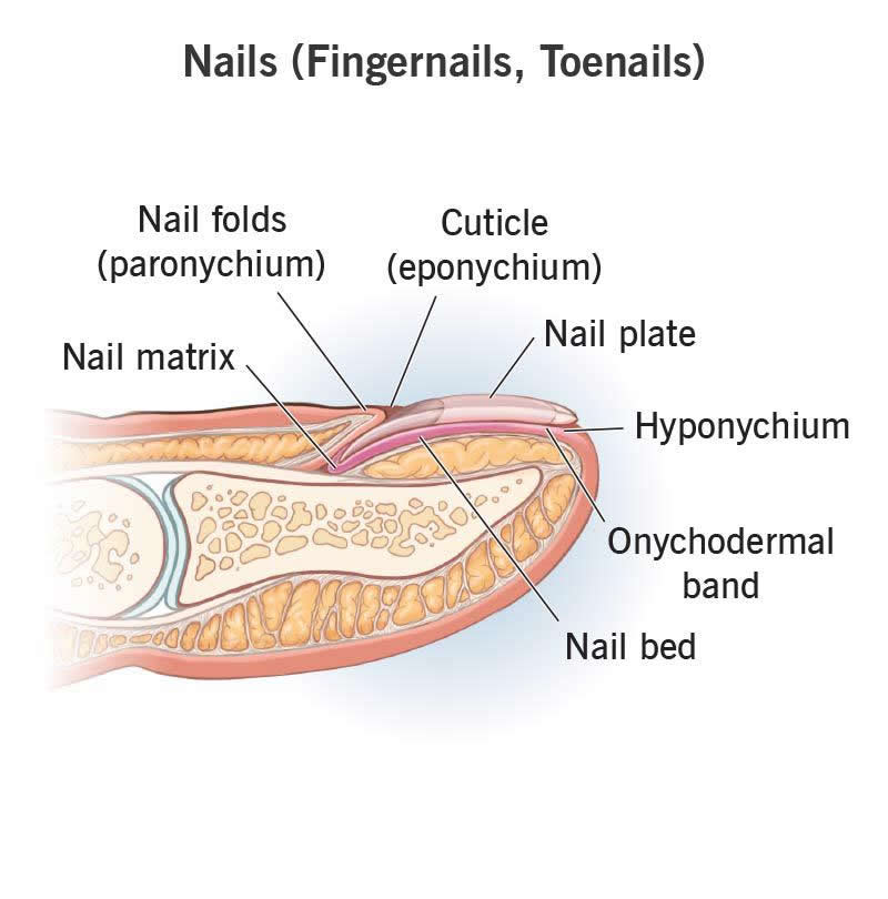 | Nail folds (paronychium) | The skin that borders each nail. Lateral folds tuck into the sides of your nail. The proximal fold is at the bottom of your nail. | Your nail folds and nail plate protect your nail matrix from ultraviolet (UV) light that could cause cancer. |