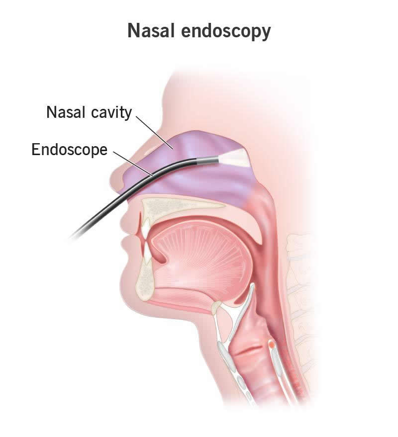 - Insert a flexible or rigid nasal endoscope into one of your nostrils and possibly pass it through your throat, stopping just above your voice box