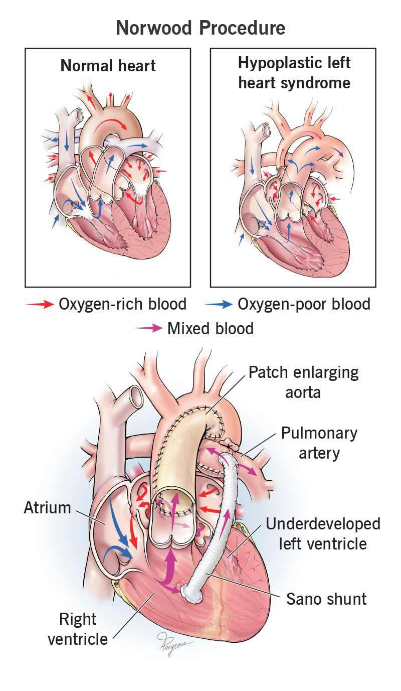 Babies with hypoplastic left heart syndrome need to have this surgery in the first weeks of life. The Norwood procedure helps their right ventricle do the work of both ventricles. Babies with HLHS need this because their left ventricle didn’t develop completely.