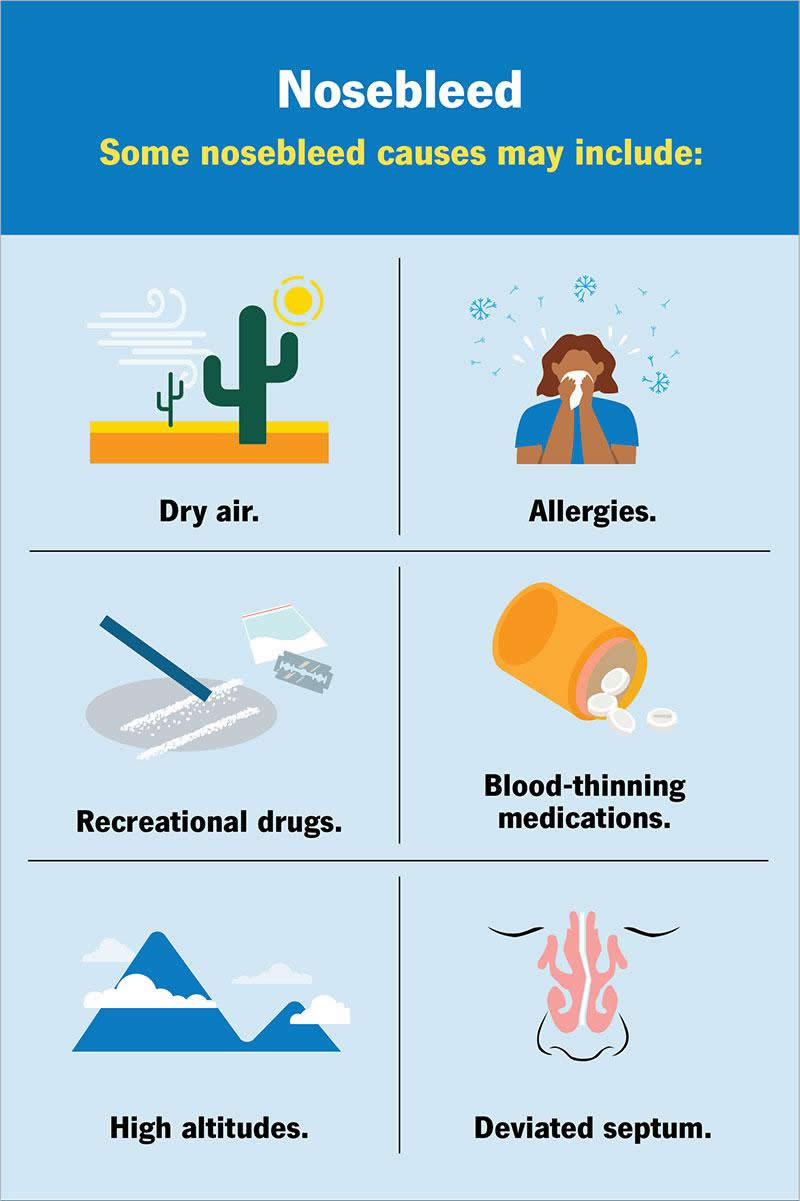 Epistaxis, or a nosebleed, is when you lose blood from the tissue that lines the inside of your nose. Dry air causes nosebleeds. There are simple steps you can take to treat and prevent them. Although annoying, nosebleeds usually aren’t a cause for concern.