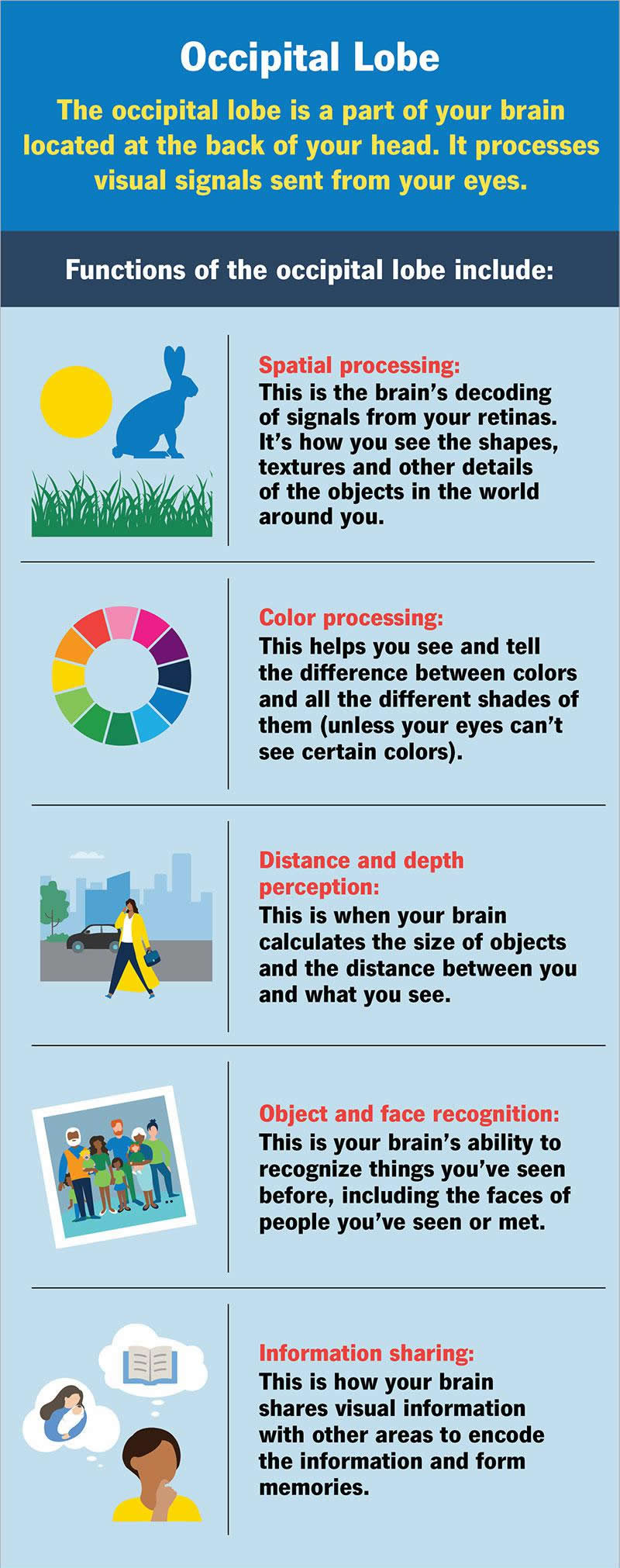 Your occipital lobe, the smallest and rear-most of the lobes, is the visual processing hub of your brain. This area processes visual signals and works cooperatively with many other brain areas. It plays a crucial role in language and reading, storing memories, recognizing familiar places and faces, and much more.