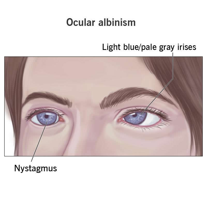 Some people with ocular albinism will have light blue/pale gray irises. But brown irises are still possible, too. Other possible eye-specific signs and symptoms can include: