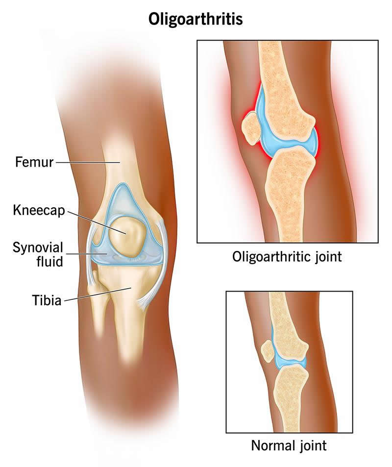 In Latin, “oligo” means “few.” If you have oligoarthritis, you have fewer than five joints affected with arthritis.