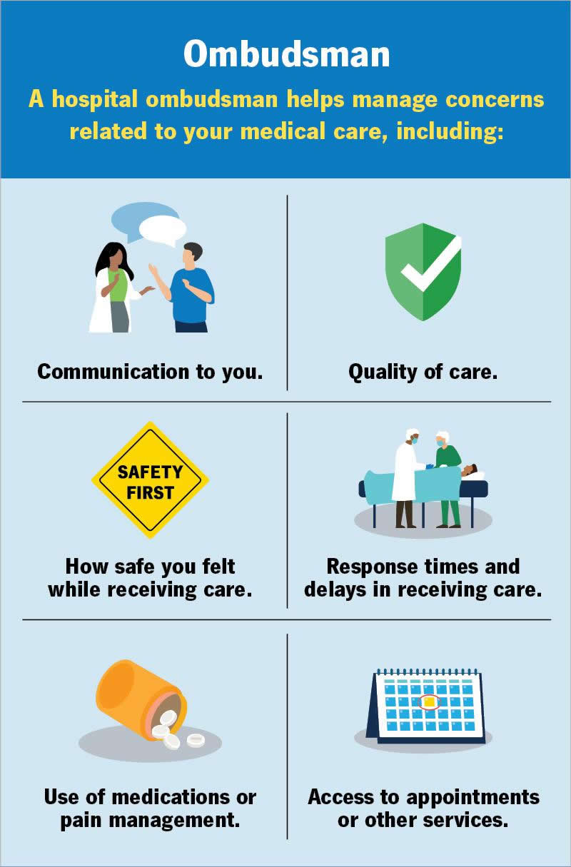 A hospital ombudsman listens to any concerns you might have about the care you’ve received and helps resolve the situation. They work with individuals and families to manage issues with communication, quality of care, safety and more. Long-term care ombudsmen address concerns among residents in nursing homes and other similar facilities.