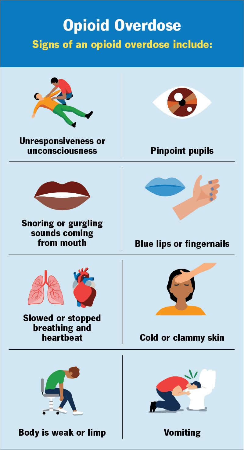 Act quickly if you notice these signs. If you carry an emergency opioid overdose reversal medication, administer it immediately. Then, contact 911 or your local emergency services number.