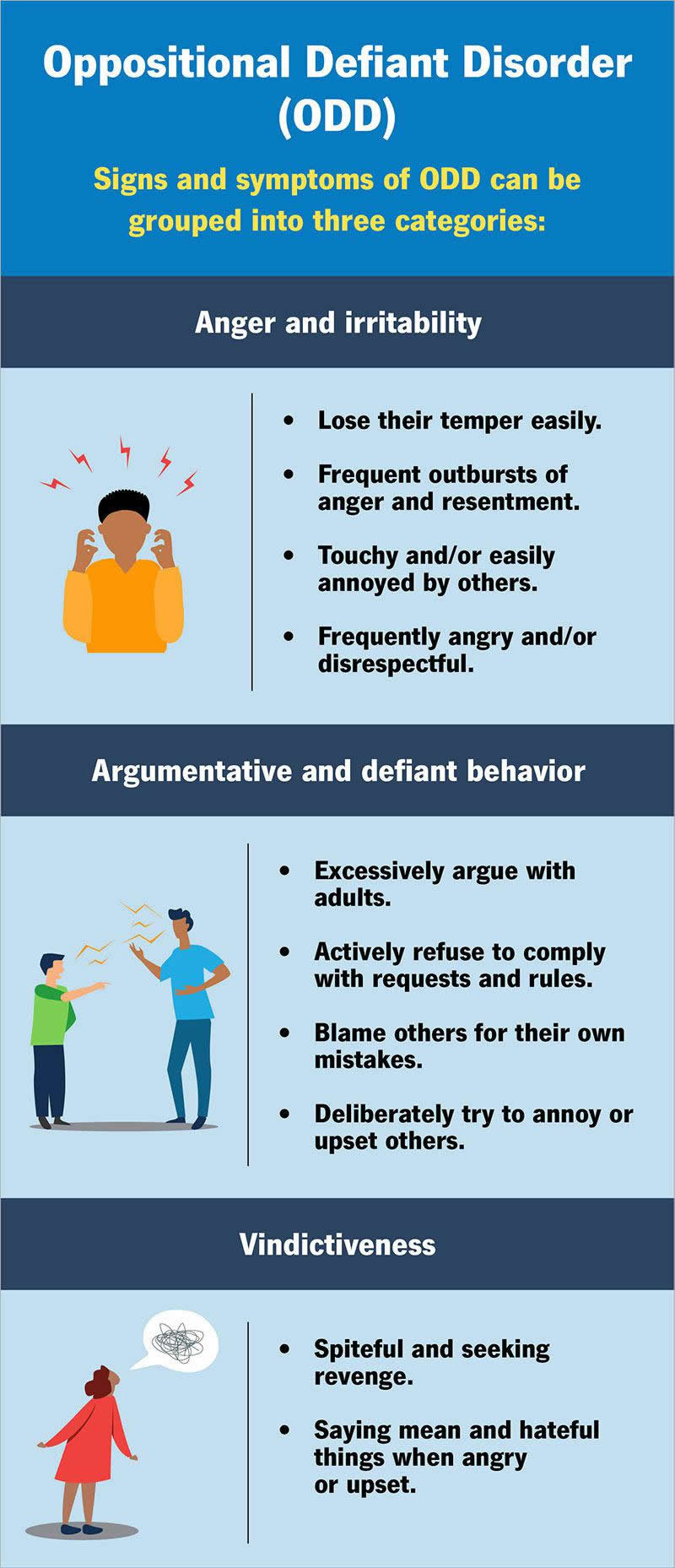 Signs and symptoms of ODD can be grouped into three categories: